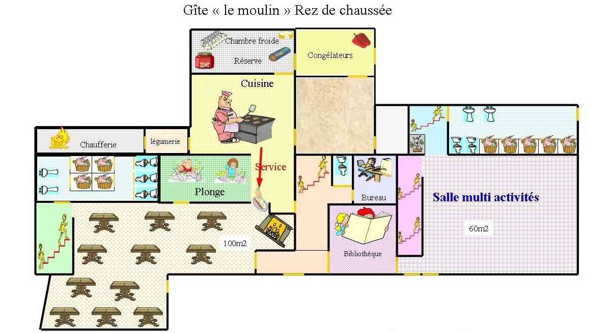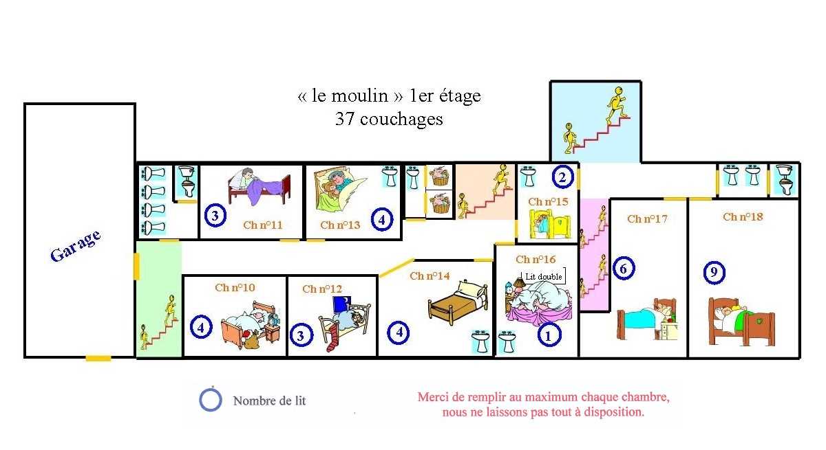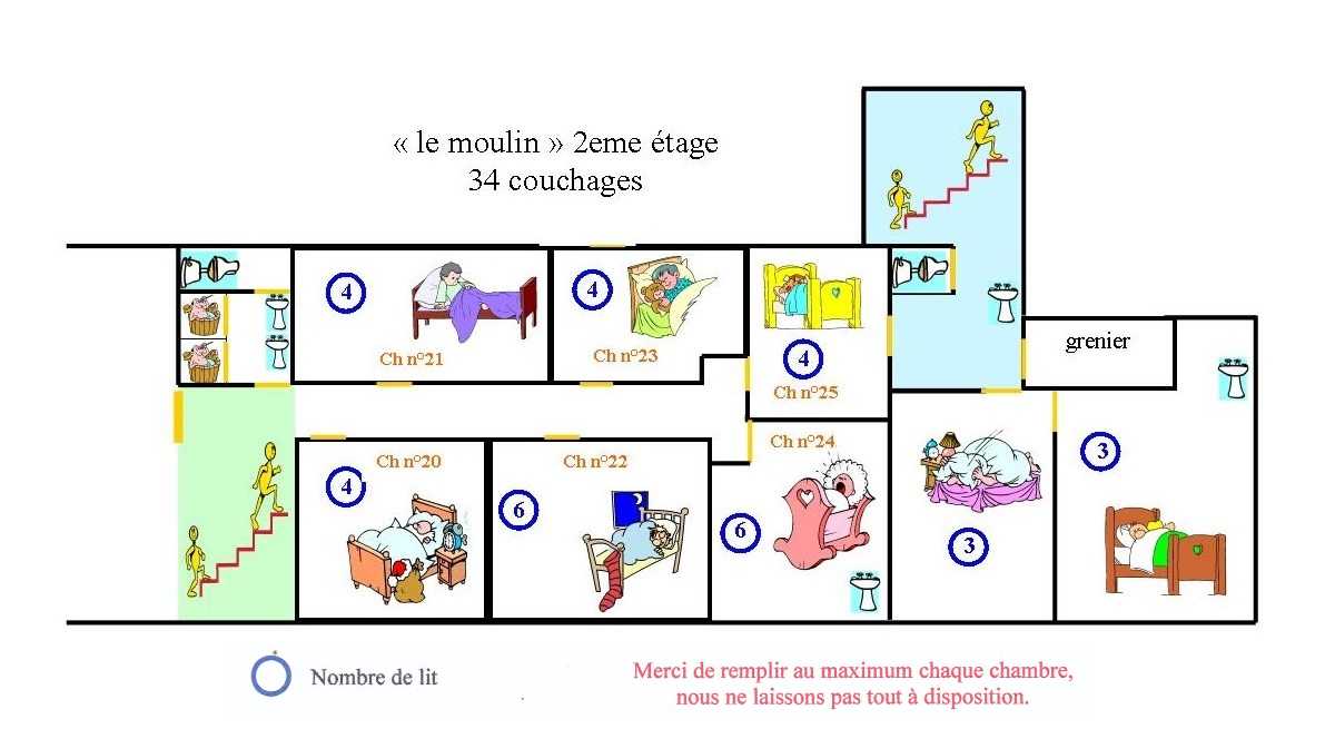 Grand gîte d’une capacité de 70 couchages. Si cela vous semble trop juste, il est possible d’ajouter les 12 lits du petit gîte.